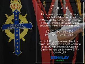 O Conselho da Ordem DeMolay do Paraná, convida a todos para Cerimônia de Investidura a Legião de Honra Honorária dos tios: IRACI DA SILVA BNORGES – Past Grão Mestre da Grande Loja do Paraná. JOÃO KRAINSKI NETO – Past Grão Mestre do Grande Oriente do Paraná. No CEOD – Pr., a ser realizada no dia …