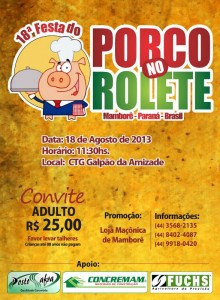 Este ano a Loja Áries nº 82 – Oriente de Mamborê, estará promovendo a 18ª Festa do Porco no Rolete naquele município. O evento deverá contará com a participação de aproximadamente 700 pessoas e acontecerá no CTG de Mamborê no dia 18 da agosto. Sendo assim, a Loja Áries e …